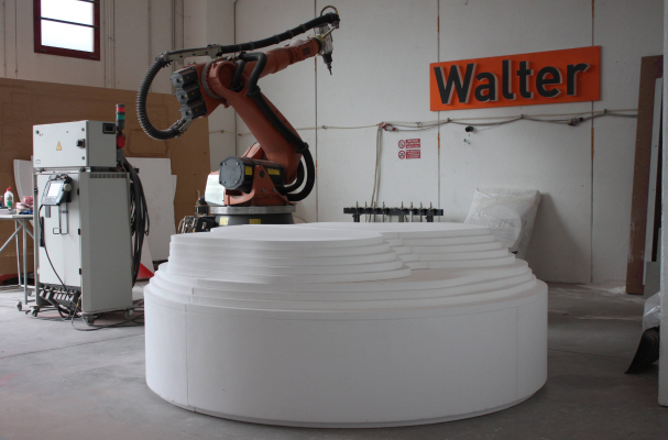 - Taglio a filo caldo del polistirolo per ottenere ogni livello con precisione geometrica;