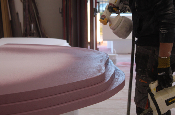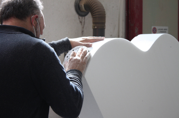 Progettazione 3D, ottimizzazione file, taglio a filo caldo, scolpitura polistirolo, lisciatura, verniciatura a mano, assemblaggio sezionale